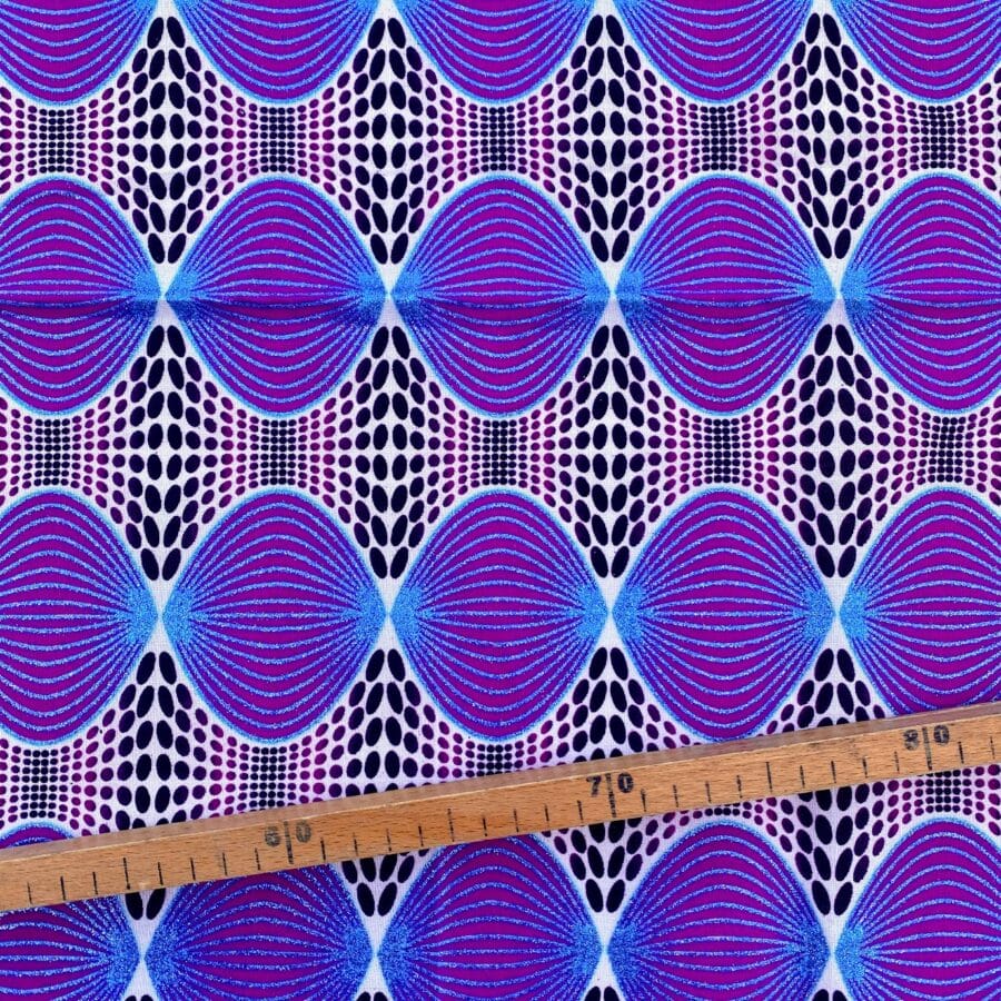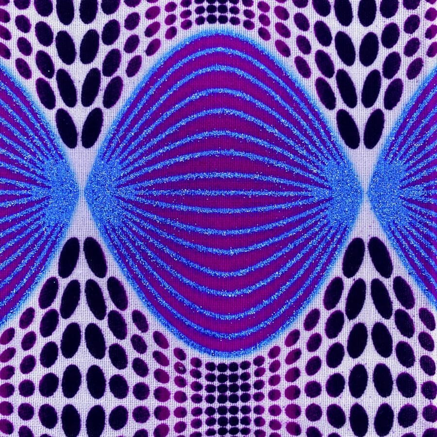N’hésitez plus et craquez pour ce Tissu Wax pailleté bleu fuchsia imprimé Seventies!