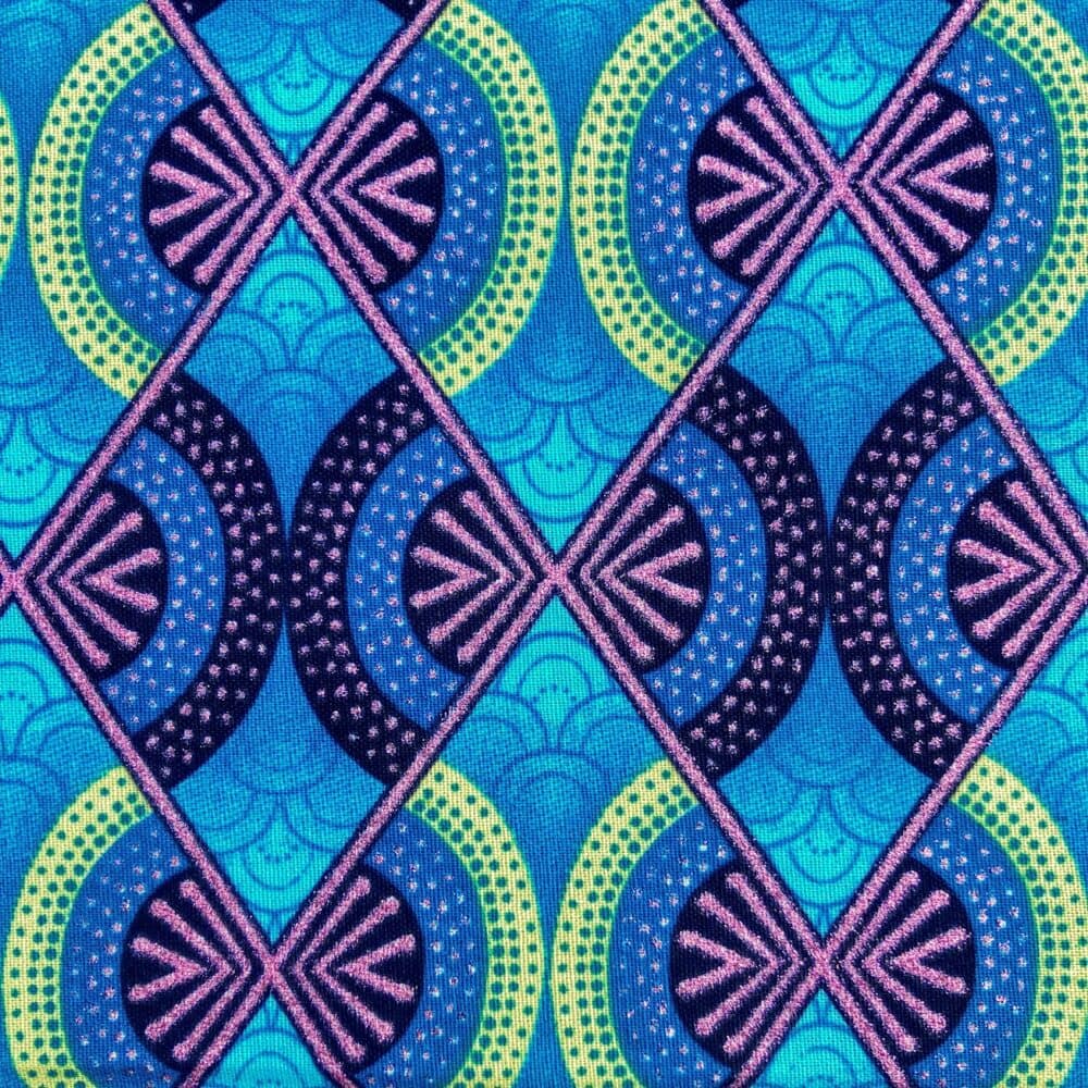 Encore un bel imprimé en vente au coupon, pour vos créations de vêtements, sacs et accessoires, décoration intérieure… Un Tissu Wax pailleté bleu rose poudré qui vous inspirera autant que moi je l’espère!