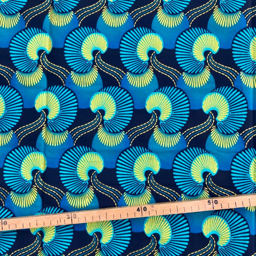 Encore un bel imprimé en vente au coupon, pour vos créations de vêtements, sacs et accessoires, décoration intérieure… Un Tissu Wax pailleté bleu turquoise qui vous inspirera autant que moi je l’espère!