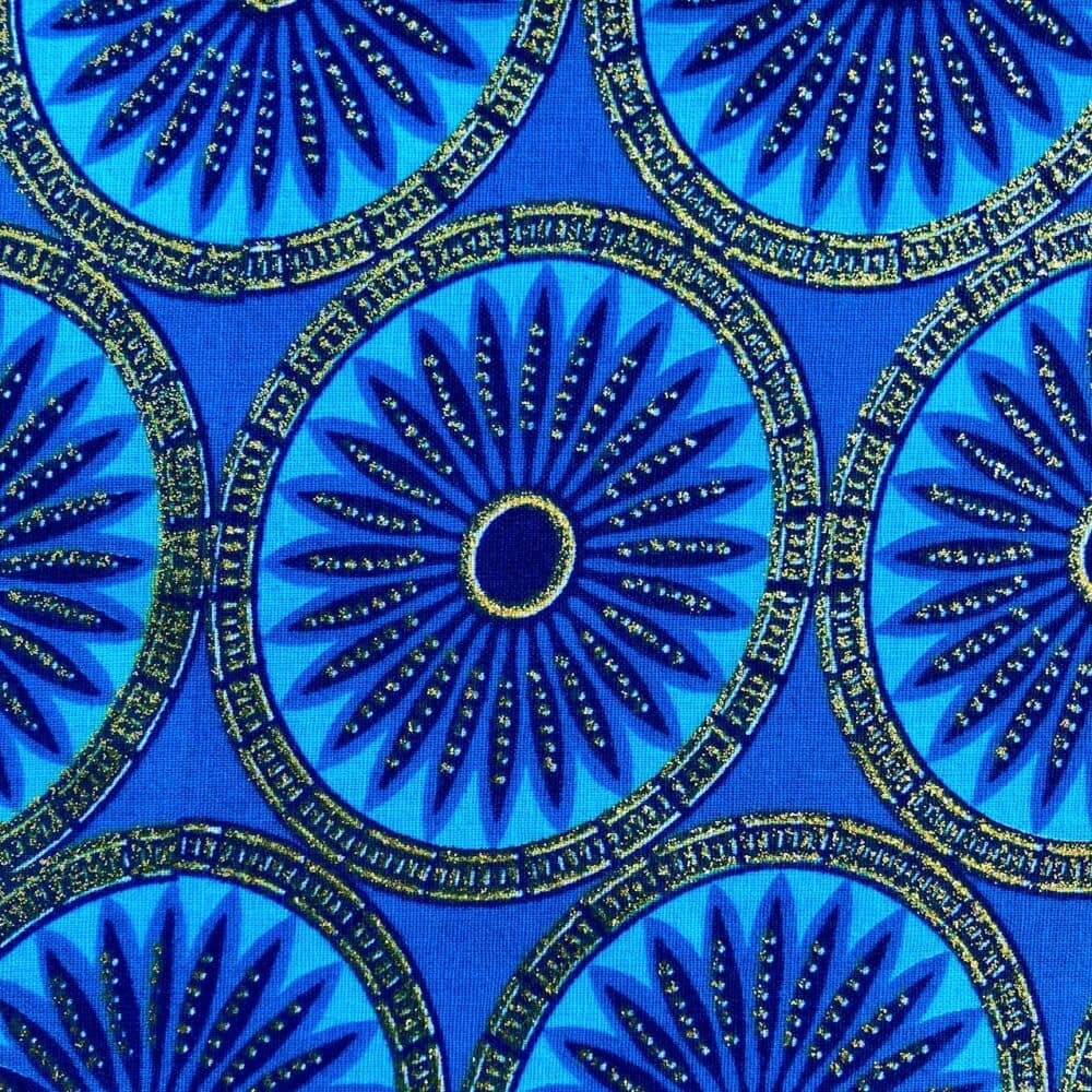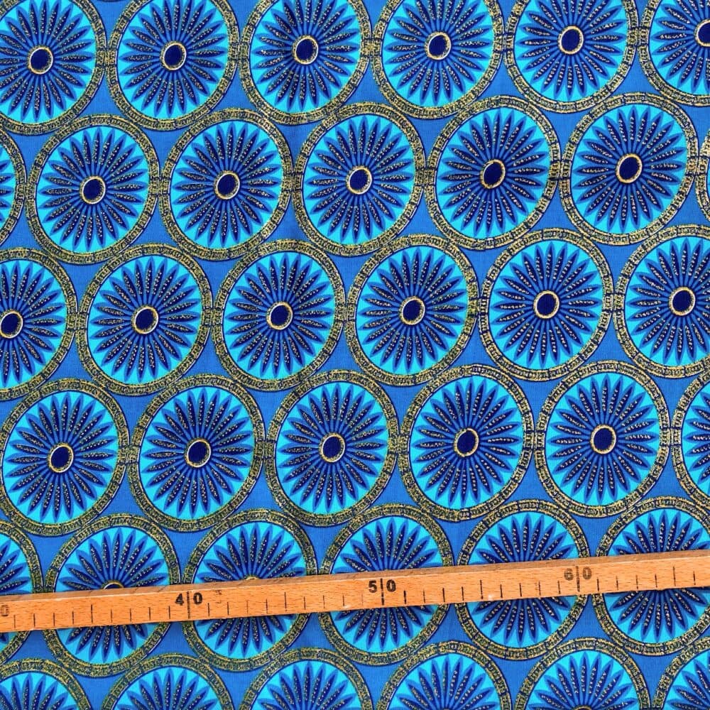 N’hésitez plus et craquez pour ce Tissu Wax pailleté bleu turquoise imprimé Rosaces!