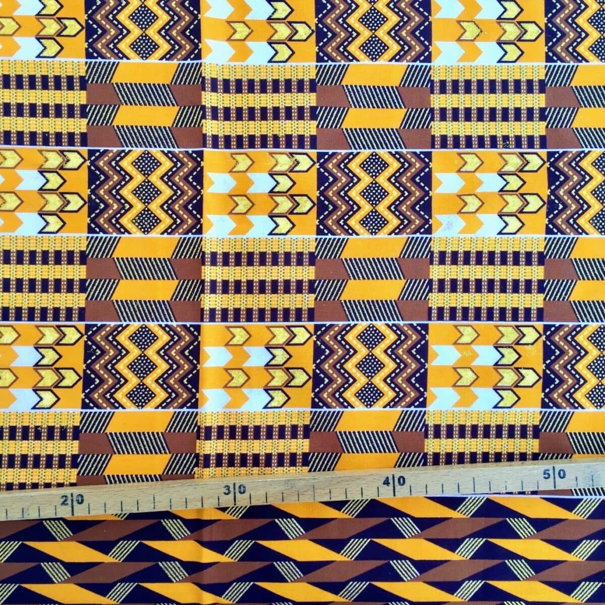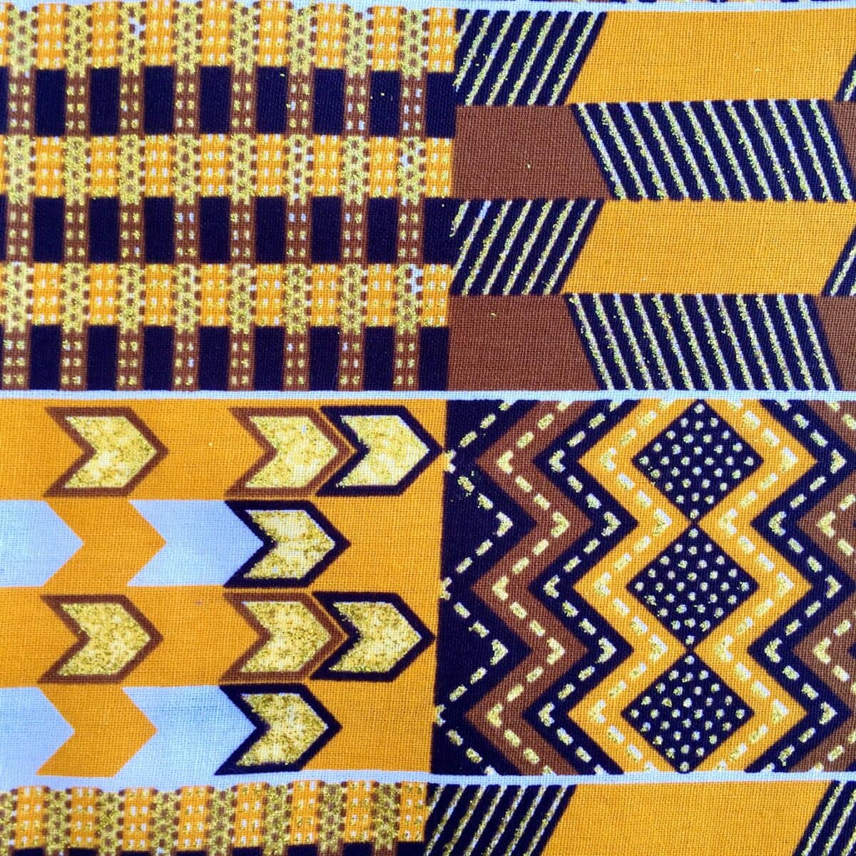 N’hésitez plus et craquez pour ce Tissu Wax pailleté jaune marron imprimé Kente!
