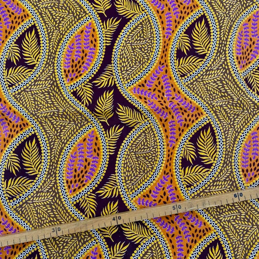 Tissu Wax pailleté marron doré imprimé Feuilles