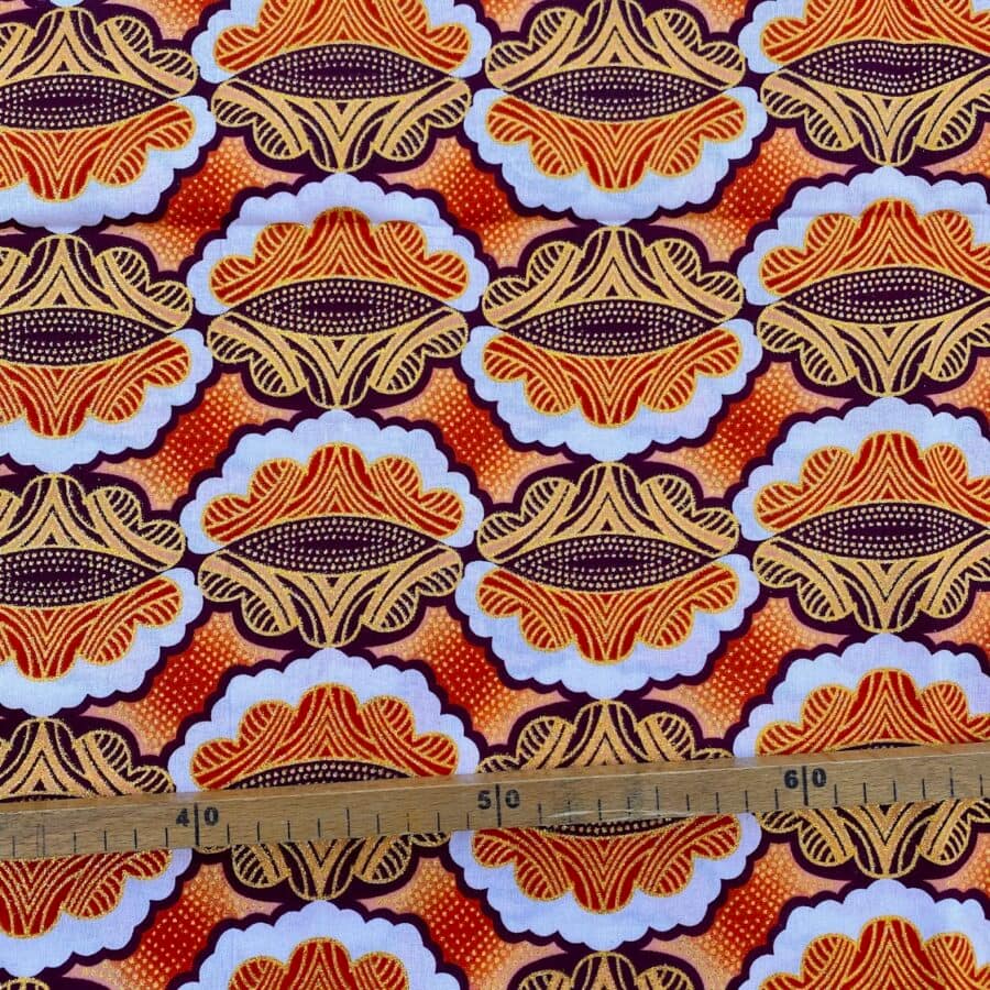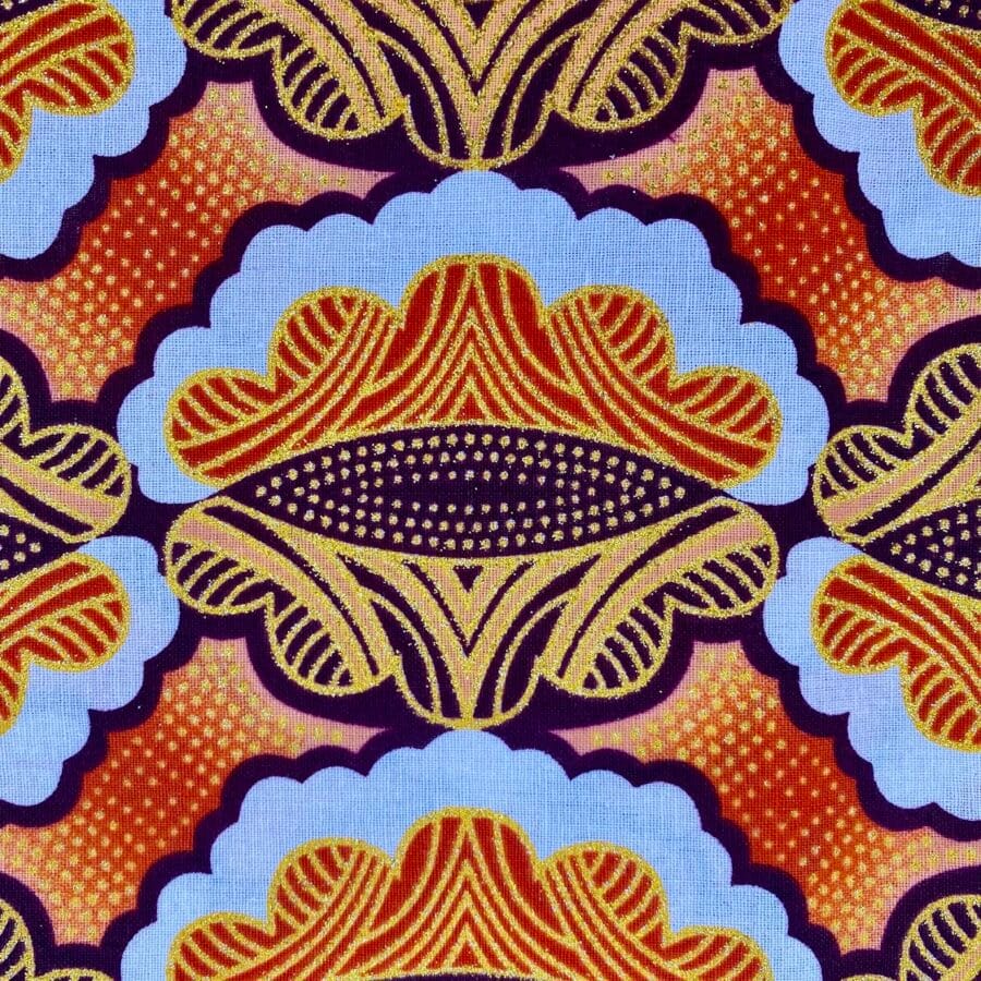 Encore un bel imprimé en vente au coupon, pour vos créations de vêtements, sacs et accessoires, décoration intérieure… Un Tissu Wax pailleté orange qui vous inspirera autant que moi je l’espère!