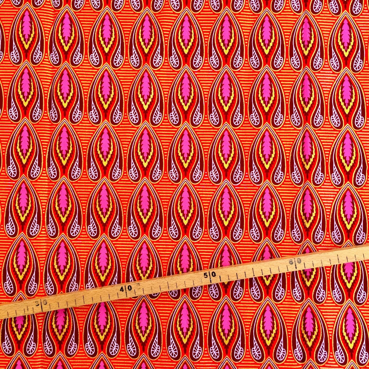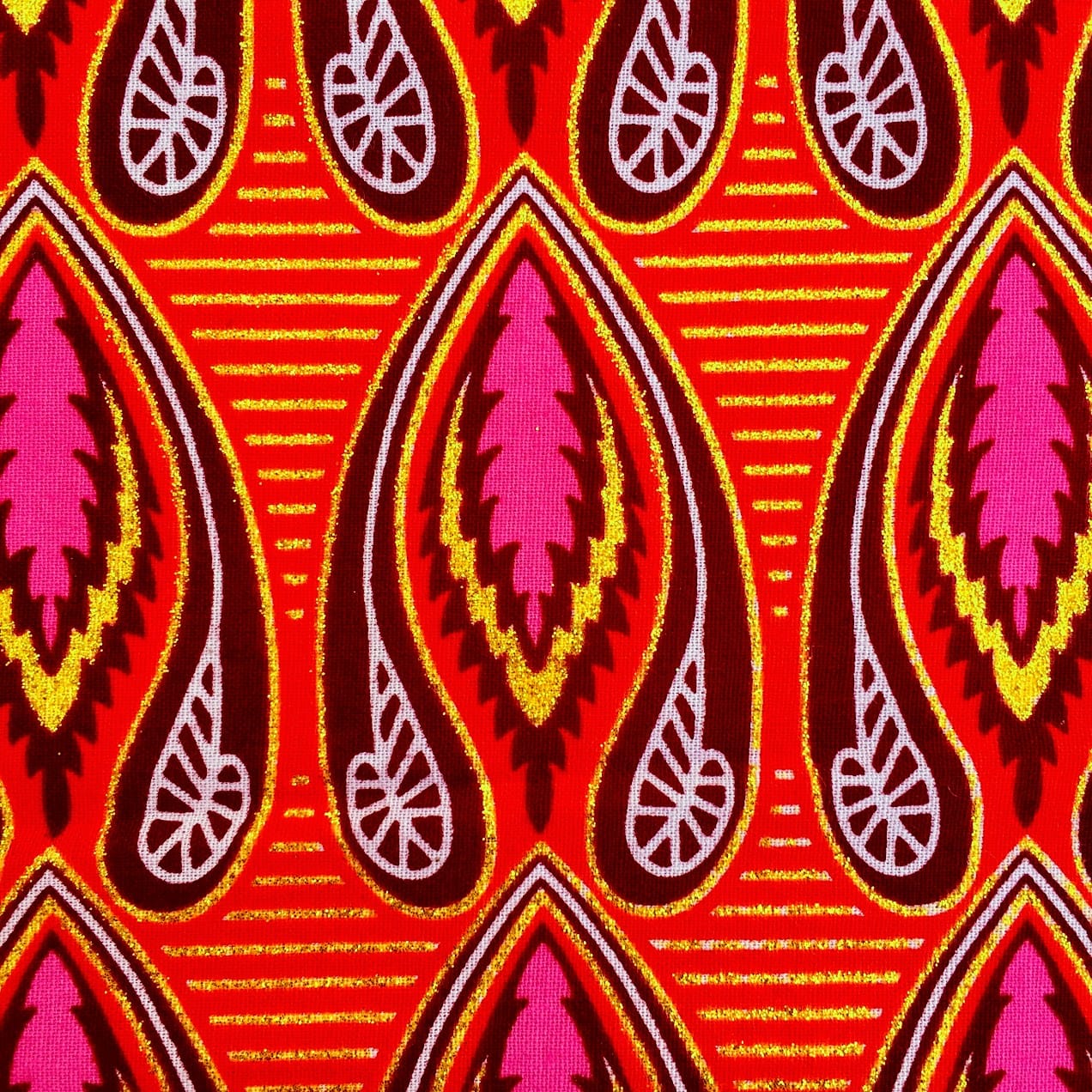 Encore un bel imprimé en vente au coupon, pour vos créations de vêtements, sacs et accessoires, décoration intérieure… Un Tissu Wax pailleté rouge qui vous inspirera autant que moi je l’espère!