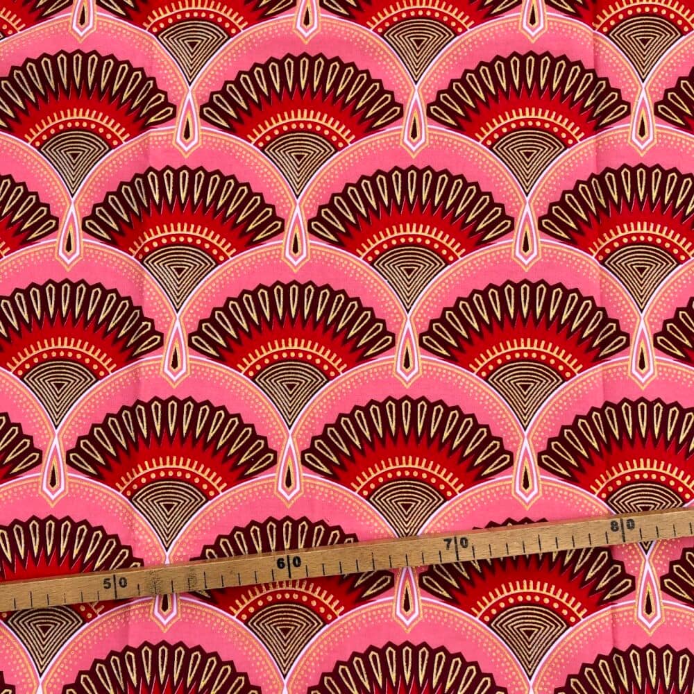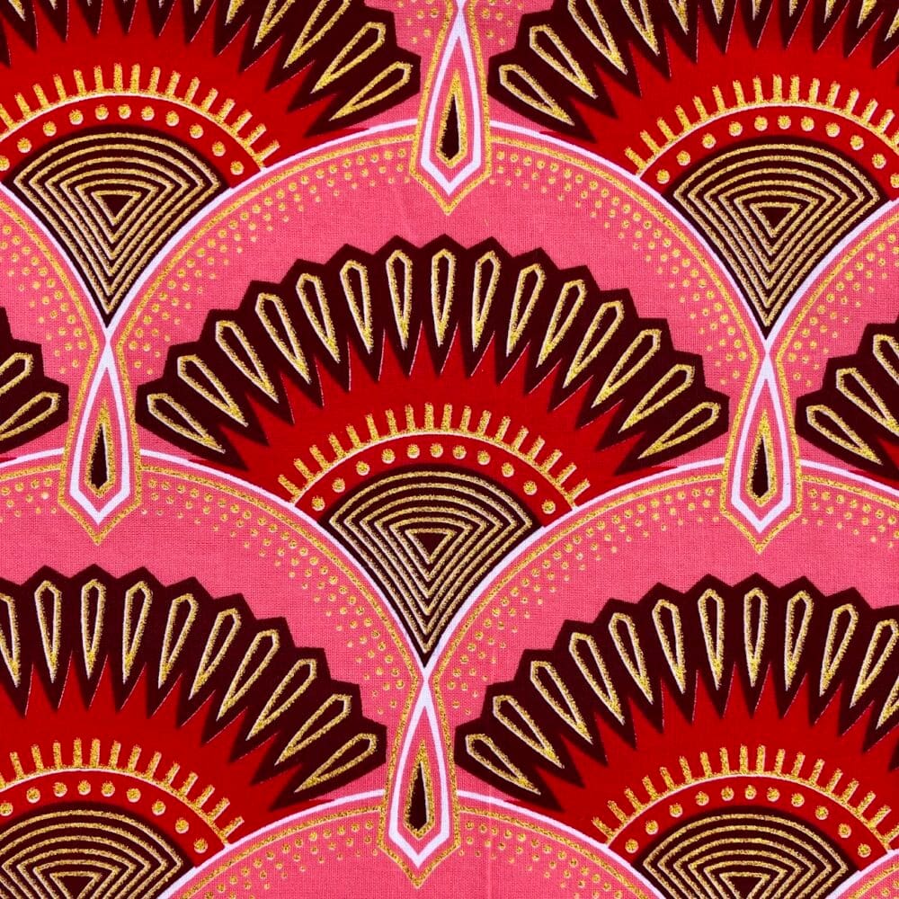 N’hésitez plus et craquez pour ce Tissu Wax pailleté rouge rose imprimé Art Déco!