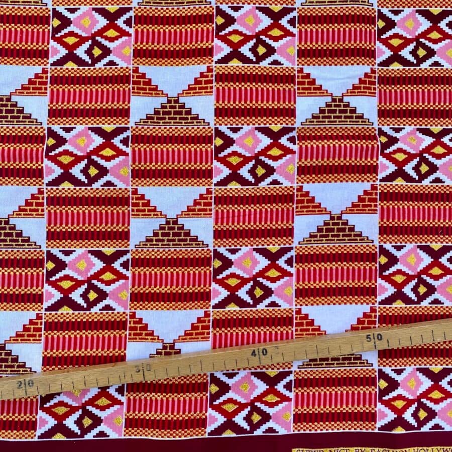 N’hésitez plus et craquez pour ce Tissu Wax pailleté rouge rose imprimé Kente!