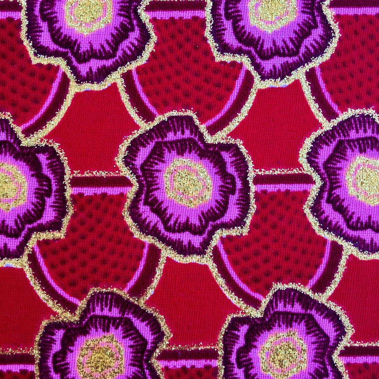 Encore un bel imprimé en vente au coupon, pour vos créations de vêtements, sacs et accessoires, décoration intérieure… Un Tissu Wax pailleté rouge rose qui vous inspirera autant que moi je l’espère!