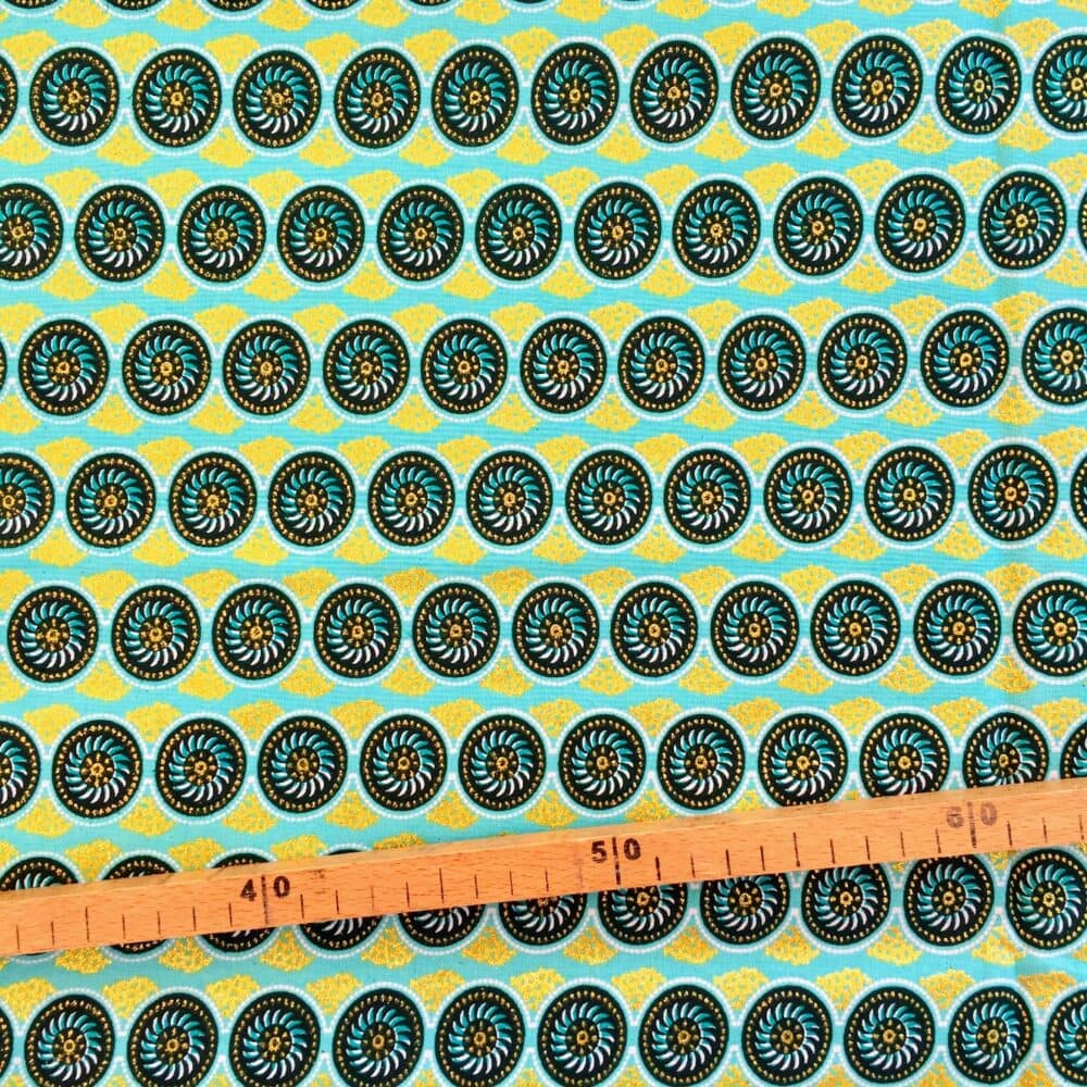 N’hésitez plus et craquez pour ce Tissu Wax pailleté turquoise imprimé Mini cercles!