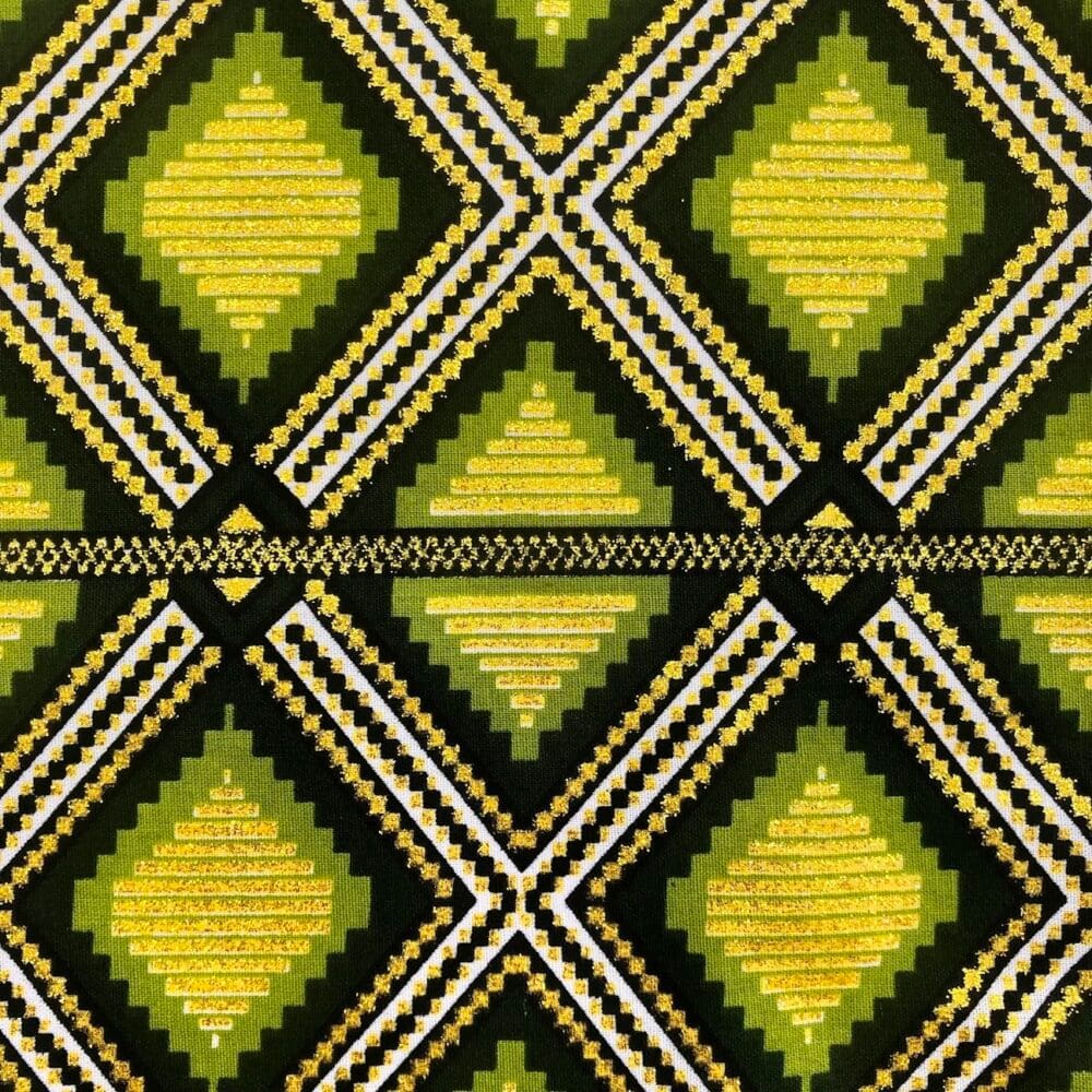 N’hésitez plus et craquez pour ce Tissu Wax pailleté vert imprimé Grille!