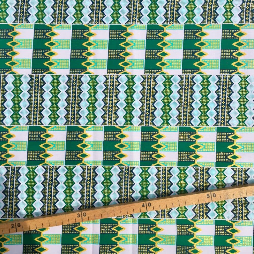 N’hésitez plus et craquez pour ce Tissu Wax pailleté vert imprimé Kente!