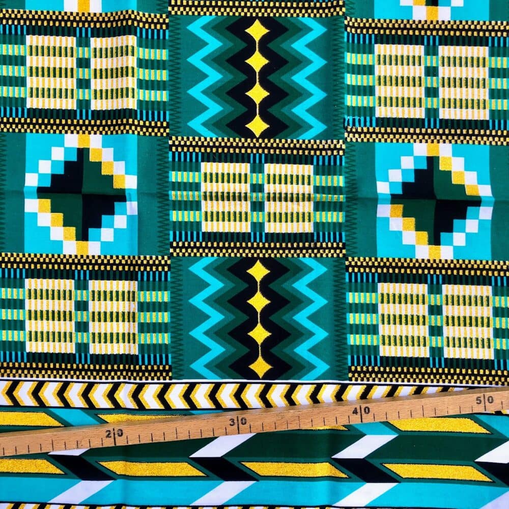 N’hésitez plus et craquez pour ce Tissu Wax pailleté vert turquoise imprimé Psyché!