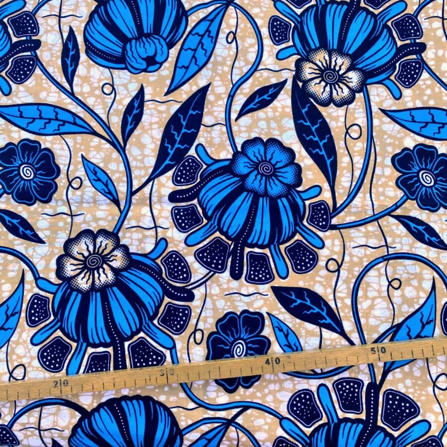 Encore un bel imprimé en vente au coupon, pour vos créations de vêtements, sacs et accessoires, décoration intérieure… Un Tissu Wax bleu beige qui vous inspirera autant que moi je l’espère!
