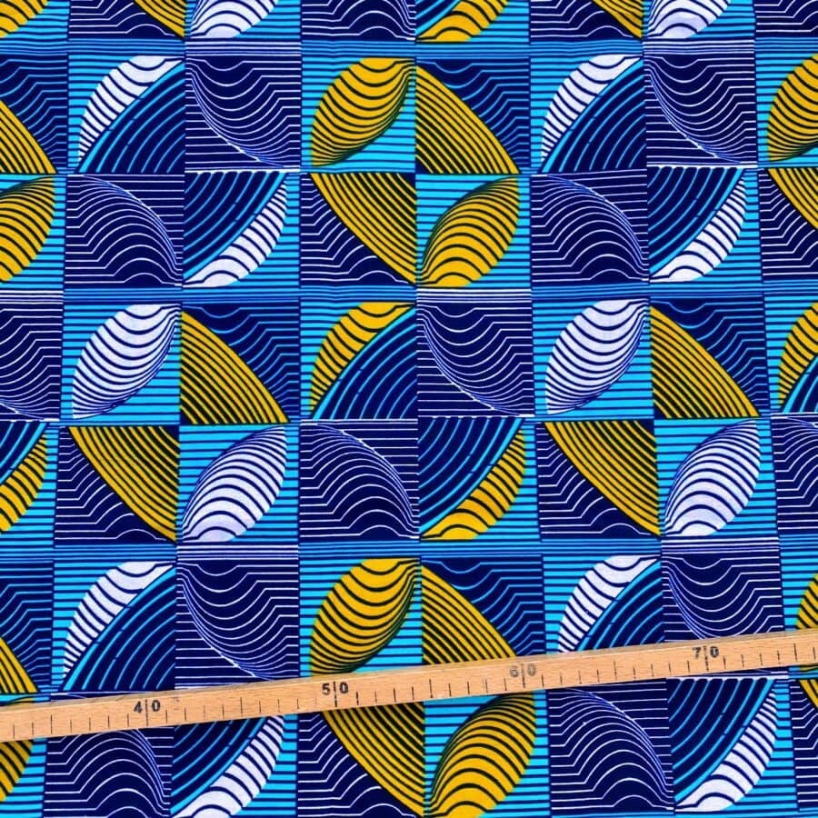 Tissu Wax bleu turquoise moutarde imprimé Géométrique