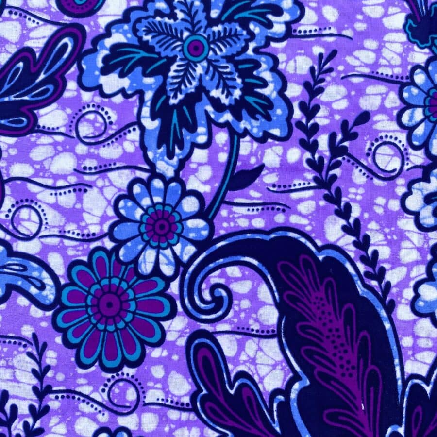 Encore un bel imprimé en vente au coupon, pour vos créations de vêtements, sacs et accessoires, décoration intérieure… Un Tissu Wax mauve bleu qui vous inspirera autant que moi je l’espère!