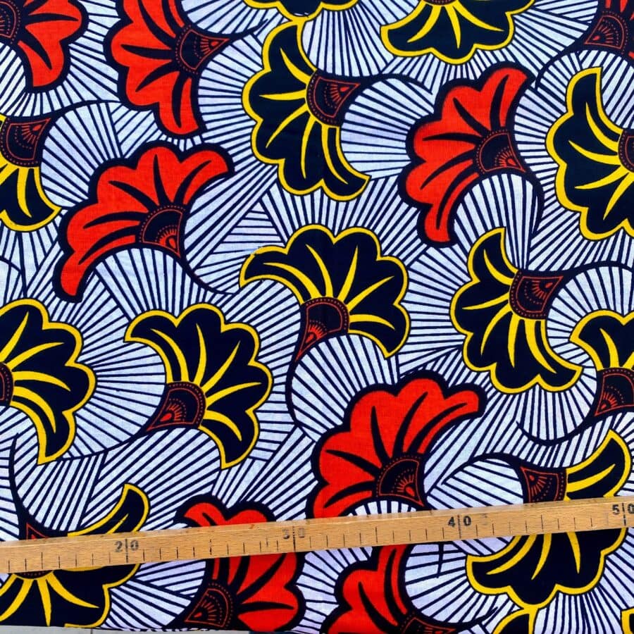 Tissu Wax rouge orangé jaune noir imprimé Fleur de Mariage