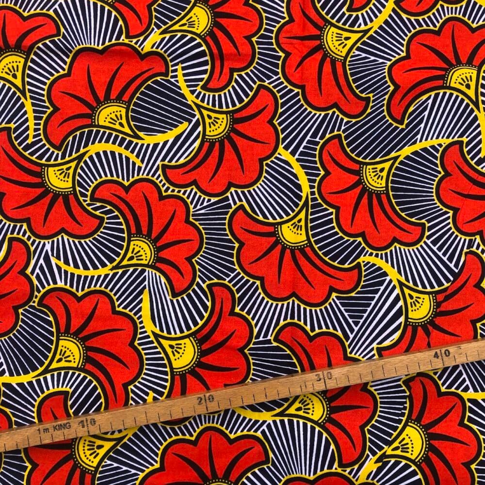 Tissu Wax rouge orangé noir imprimé Fleur de mariage