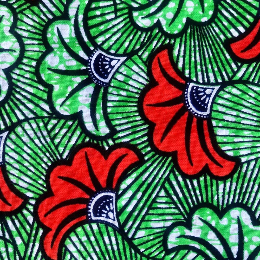 Encore un bel imprimé en vente au coupon, pour vos créations de vêtements, sacs et accessoires, décoration intérieure… Un Tissu Wax vert rouge qui vous inspirera autant que moi je l’espère!